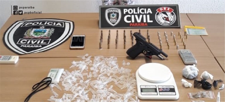 Com ele foram encontradas dezenas de munições, uma pistola, pinos para embalagem de drogas, balanças de precisão, além de entorpecentes prontos para consumo.